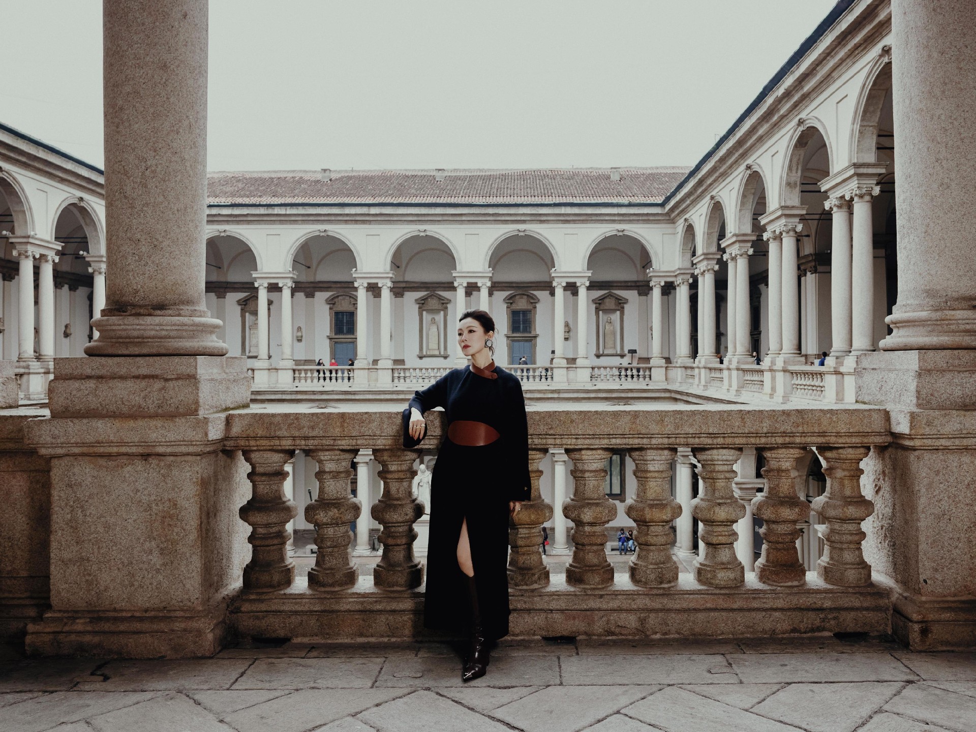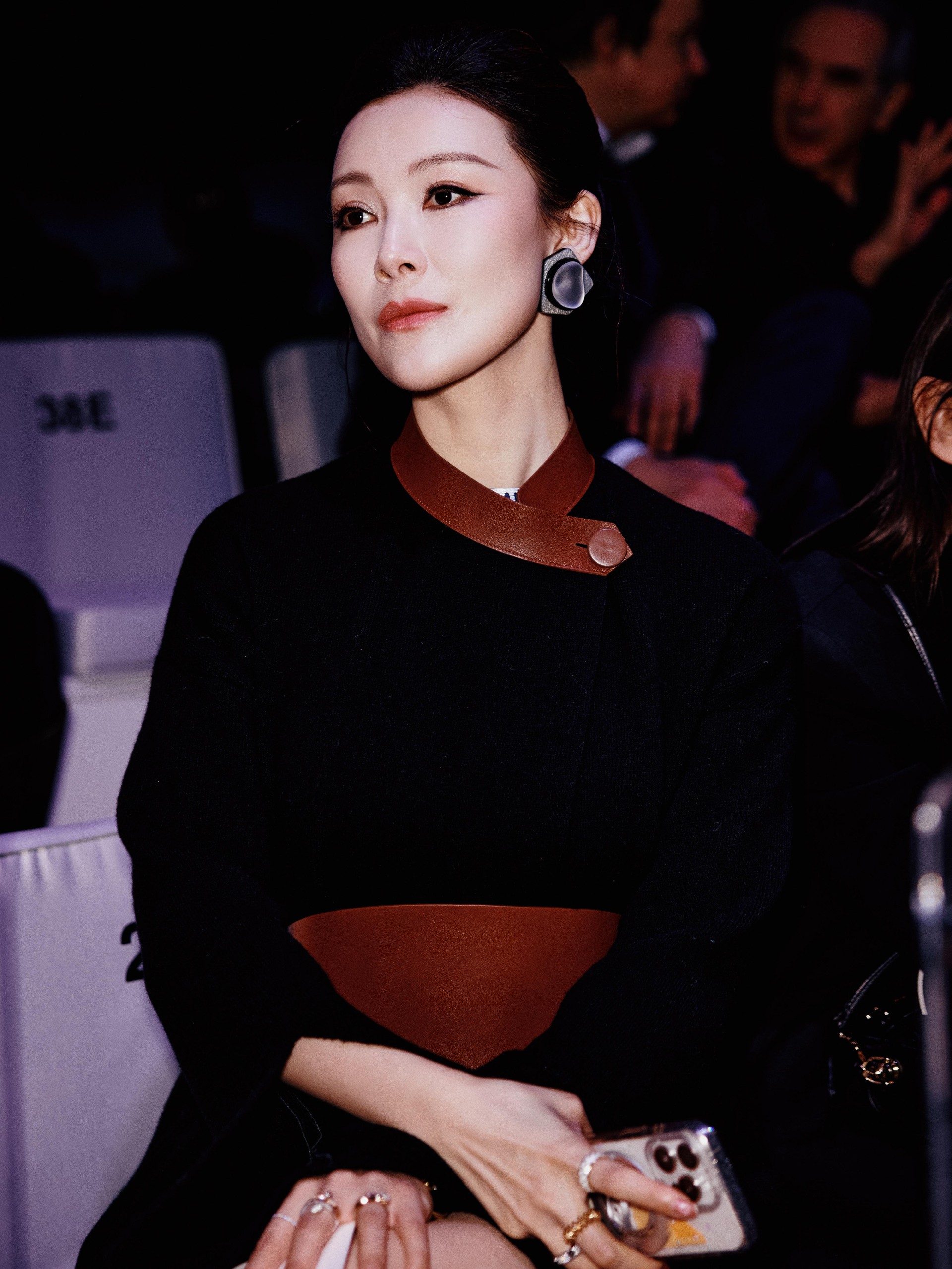 阿玛尼秀场内,她身着Giorgio Armani 全黑长裙亮相,整体造型没有任何多余设计,顶级面料和剪裁,完美诠释阿玛尼品牌的低调奢华属性。腰间棕色皮质配饰点睛,复古又干练,美到了心巴上!